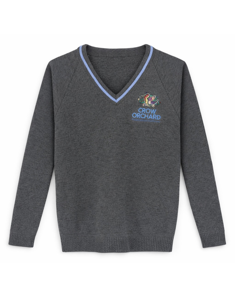 Garment Description: Grey jumper with Sky Blue stripe and school logo . From our pilex range which provides a softer finish to the jumper allowing for extra comfort.