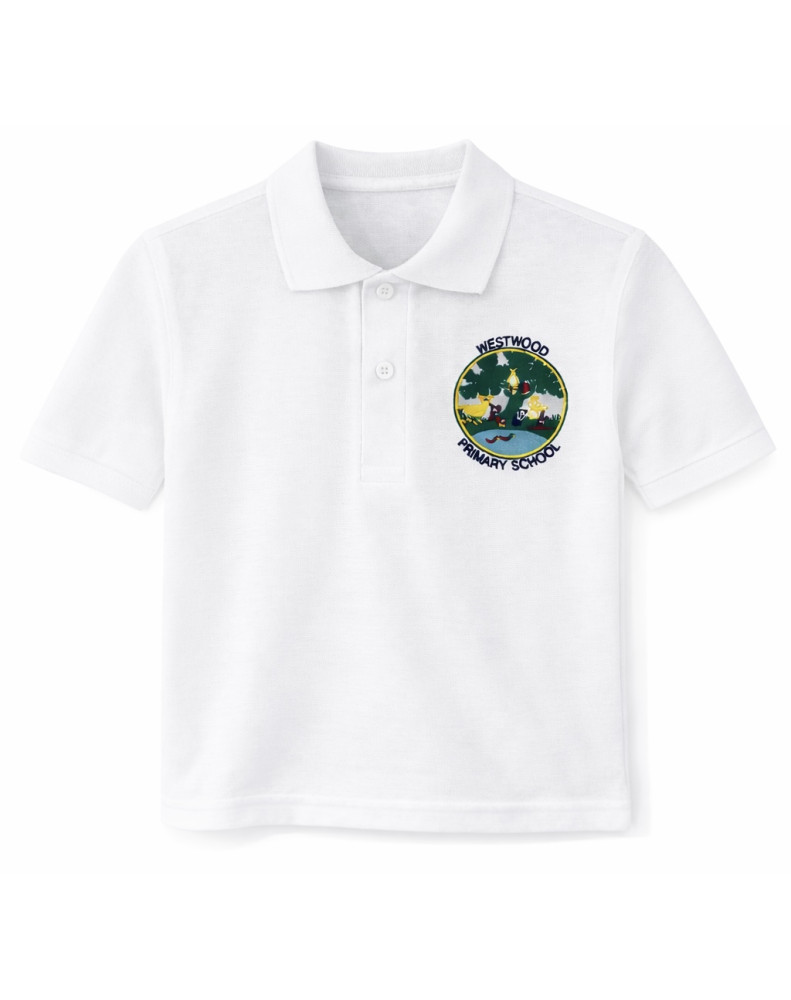 Garment Description: White Polo Shirt with school logo. 65% Cotton and 35% Polyester.